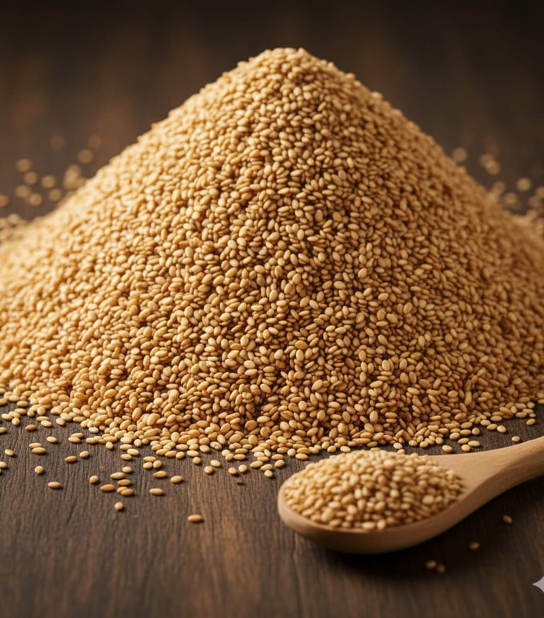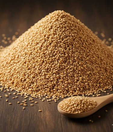 Discover the rich, nutty flavor of our premium golden sesame seeds, beautifully presented in a generous pile on a rustic wooden surface, with a handcrafted wooden spoon filled with these nutrient-packed gems.