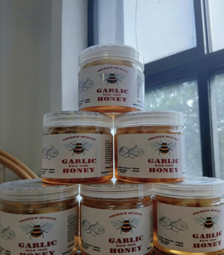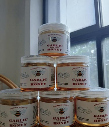 Experience the perfect harmony of taste and wellness with our Garlic Honey Infusion. Each jar is carefully packed with whole, hand-selected garlic cloves gently steeped in luscious, golden pure honey. This delightful blend not only boosts your immunity naturally, but also adds a bold, gourmet touch to your favorite dishes — from marinades and dressings to teas and cheeses. Packaged in a 250ml clear glass jar that showcases its beautiful amber hue and plump garlic cloves, it's a versatile addition to any kitchen or thoughtful gift for food lovers.